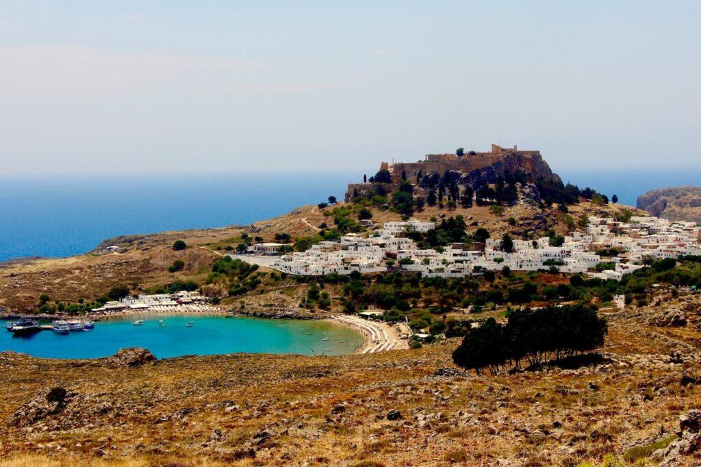 It is 22 nautical miles from the port of Rhodes, about an hour by boat.